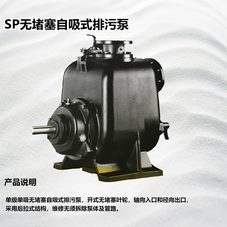 南方SP單級單吸無堵塞自吸式排污泵,開式無堵塞葉輪,軸向入口和徑向出口,采用后拉式結構,維修無須拆除泵體及管路。